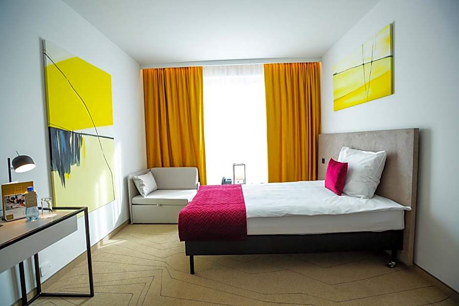 This modern single room features free WiFi and air-conditioning, a 47 in wide bed, as well as a fold-out sofa, a desk, a coffee table, a flat-screen TV with cable channels and coffee and tea making set.